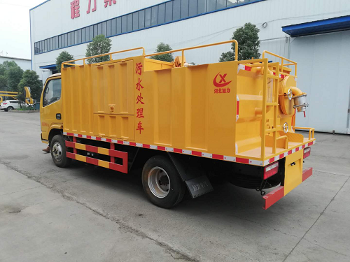 污水处理车采用东风多利卡底盘,整车长为5.93米、宽为2.16米,高为2.57米。可上蓝牌,有免征公告,能够在市内使用。该车是我公司专门针对环卫疏通保洁公司设计制造的,采用圆筒滤网加无轴螺旋的结构对化粪池的污物进行处理,实现固液分离,可即抽即排。抽出的污物不需要 像传统的吸污车那样运到另一个地方倒掉,可当场处理,处理后的污水通过市政管网排走,粪渣可直接打包,当生活垃圾处理。即节省了运输费用,又提高了处理速度。污水处理车即可以靠车身主发动机提供作业动力,也可外接电源使用电机提供作业动力,非常方便。采用水环真空泵进行持续增压,自吸高度可达9米,即使吸污管半管吸污也能保证有效吸取。采用专用防堵设计排污泵,使其能在边吸边排的过程中防止泵体被堵而影响作业,处理速度可达80-100m³/h。该车可根据客户需求,加装高压清洗泵,使其具有高压清洗、管道疏通的功能。